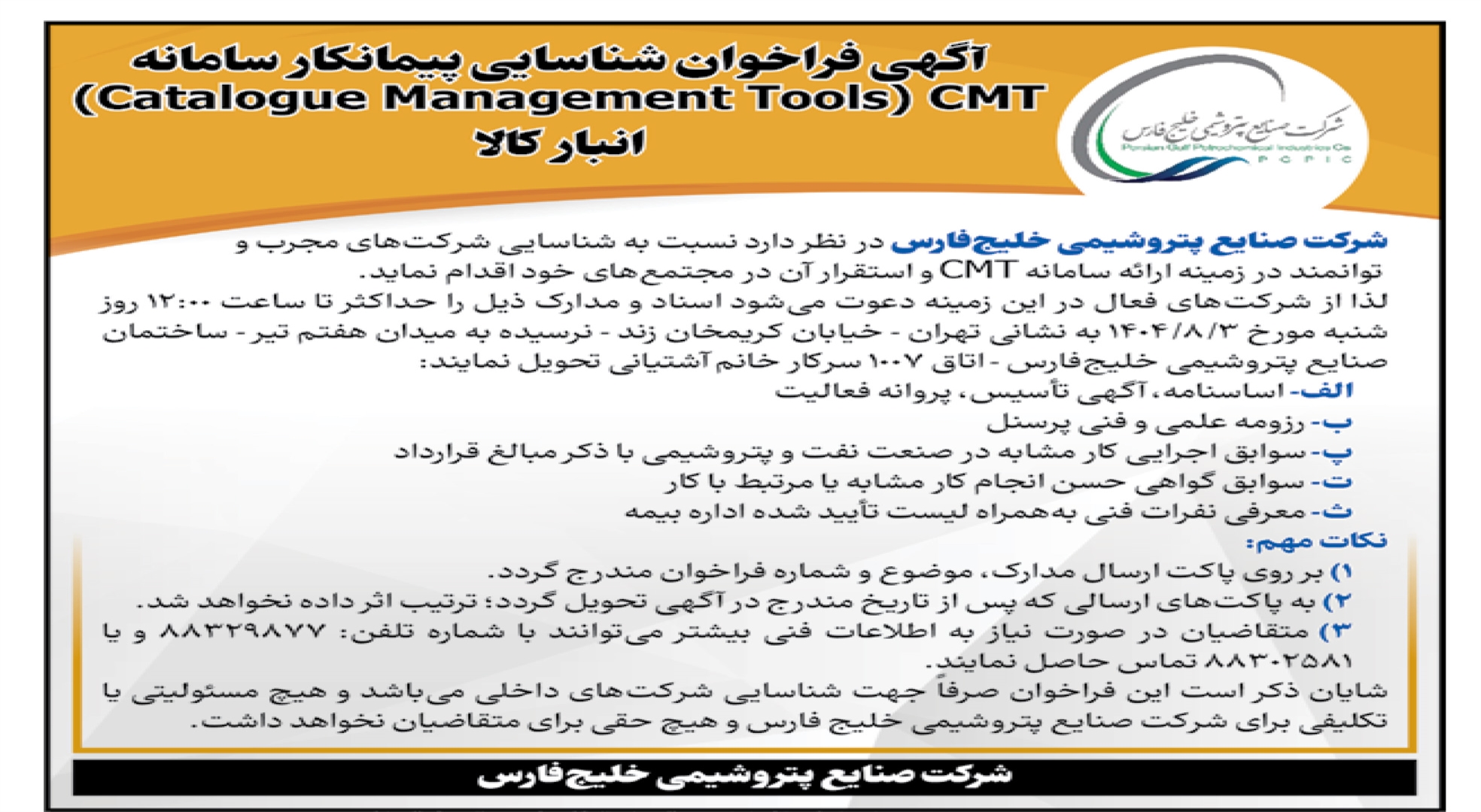 لذا از شرکتهای فعال در این زمینه دعوت میشود اسناد و مدارک ذیل را حداکثر تا ساعت 12:00 روز شنبه مورخ 1404/08/03 به نشانی تهران – خیابان کریمخان زند نرسیده به میدان هفتم تیر ساختمان صنایع پتروشیمی خلیج فارس اتاق 1007 سرکار خانم آشتیانی تحویل نمایند: