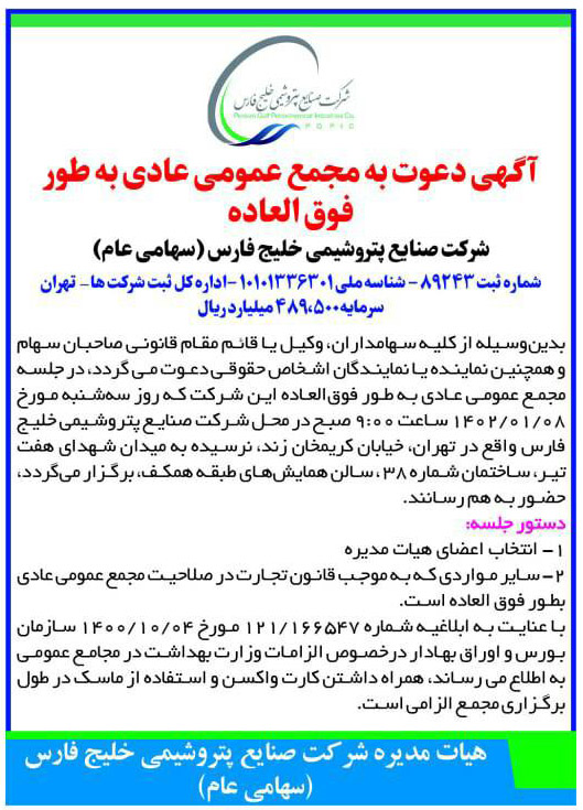 بدینوسیله از کلیه سهامداران، وکیل یا قائم مقام قانونی صاحبان سهام و همچنین نماینده یا نمایندگان اشخاص حقوقی دعوت میگردد، در جلسه مجمع عمومی عادی بطور فوقالعاده این شرکت که روز سهشنبه مورخ 1402/01/08 ساعت 9:00 صبح در محل شرکت صنایع پتروشیمی خلیج فارس واقع در تهران، خیابان کریمخان زند، نرسیده به میدان شهدای هفت تیر، ساختمان شماره 38 ، سالن همایشهای طبقه همکف، برگزار میگردد، حضور به هم رسانند.