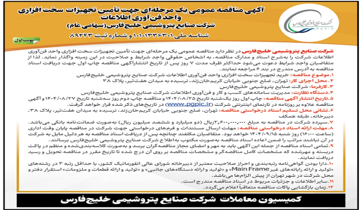 - موضوع مناقصه: خرید تجهیزات سخت افزاری واحد فناوری اطلاعات شرکت صنایع پتروشیمی خلیج فارس.