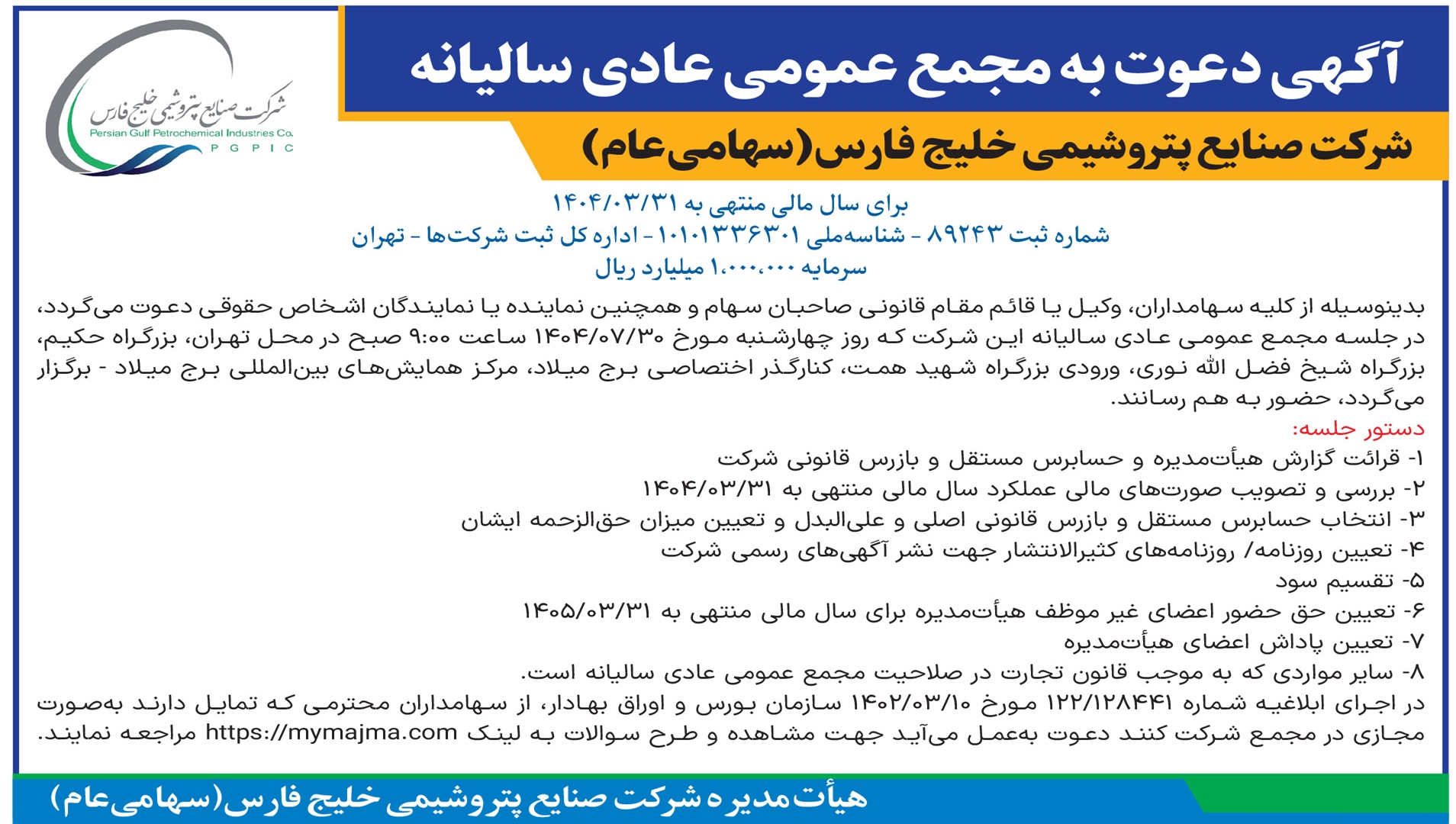 بدینوسیله از کلیه سهامداران، وکیل یا قائم مقام قانونی صاحبان سهام و همچنین نماینده یا نمایندگان اشخاص حقوقی دعوت میگردد، در جلسه مجمع عمومی عادی سالیانه این شرکت که روز چهارشنبه مورخ 1404/07/30 ساعت 09:00 صبح در محل تهران، بزرگراه حکیم، بزرگراه شیخ فضل اله نوری، ورودی بزرگراه شهید همت، کنارگذر اختصاصی برج میلاد، مرکز همایشهای بینالمللی برج میلاد - برگزار میگردد، حضور به هم رسانند.