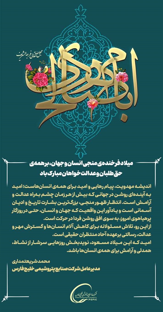 • پیام تبریک مدیرعامل گروه صنایع پتروشیمی خلیج‌فارس به مناسبت میلاد فرخنده منجی انسان و جهان، حضرت ولی‌عصر (عج)