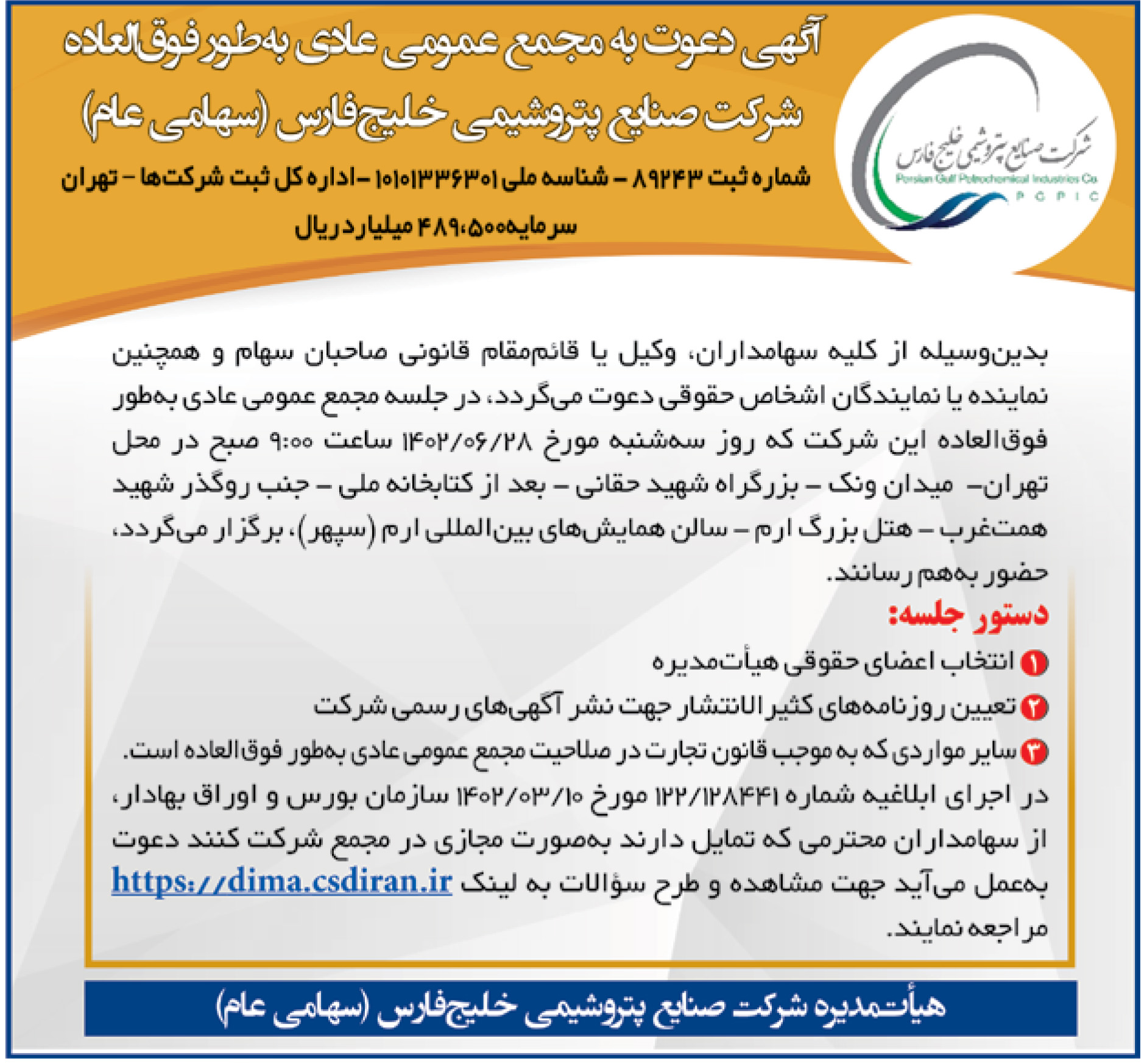 بدینوسیله از کلیه سهامداران، وکیل یا قائم مقام قانونی صاحبان سهام و همچنین نماینده یا نمایندگان اشخاص حقوقی دعوت میگردد، در جلسه مجمع عمومی عادیبطورفوقالعاده این شرکت که روز سهشنبه مورخ 1402/06/28 ساعت 9:00 صبح در محل تهران – میدان ونک – بزرگراه شهید حقانی – بعد از کتابخانه ملی – جنب روگذر شهید همتغرب – هتل بزرگ ارم - سالن همایشهای بین المللی ارم (سپهر)، برگزار میگردد، حضور به هم رسانند.