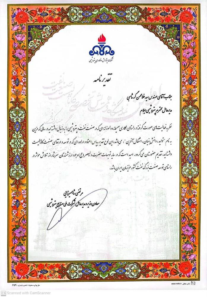 در اولین همایش تخصصی کاتالیست صنعت نفت در صنایع ملی پتروشیمی، مدیر عامل شرکت ملی صنایع پتروشیمی از سیدغلامحسن گرشاسبی در راستای آزمایش موفقیت‌آمیز کاتالیست داخلی Saz201 در واحد پلی اتیلن سنگین پتروشیمی ایلام تقدیر کرد.